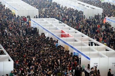 11月20日,“江蘇省暨南京市2009屆普通高校畢業(yè)生公益供需洽談會”在南京國際展覽中心舉行,近千家用人單位為畢業(yè)生提供有效需求職位4萬多個,參會用人單位及數(shù)萬應聘畢業(yè)生均免費入場。江蘇省2009年高校畢業(yè)生總數(shù)將達45.8萬人,比2008年增加約3萬人,畢業(yè)生人數(shù)再創(chuàng)歷史新高。