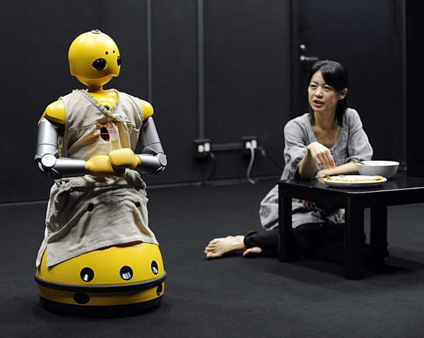 25日,在日本大阪大學(xué),一個取名為若丸的機(jī)器人與一名女演員同臺表演。當(dāng)天,這臺為媒體舉行的20分鐘演出由機(jī)器人與演員共同完成,該劇有可能于明年公演。新華社/法新
