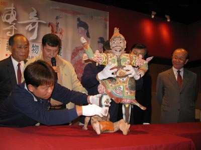 “絲路傳奇——新疆文物大展”12月3日在臺灣歷史博物館舉行開箱儀式。據(jù)主辦方介紹,所有參展文物準(zhǔn)備就緒后,將于12月6日正式和臺灣民眾見面,持續(xù)展出3個多月。 圖為兩岸文物專家和協(xié)辦單位代表一起,為木雕天王踏鬼俑開箱。