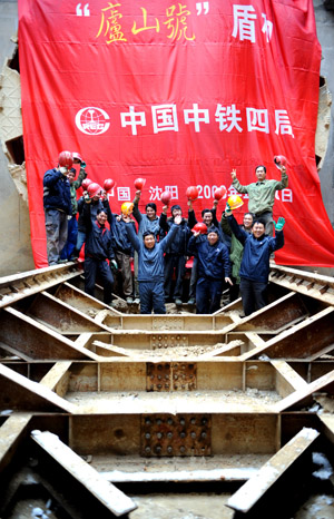 12月8日,參加沈陽(yáng)地鐵二號(hào)線工程建設(shè)的中國(guó)中鐵四局職工在“廬山號(hào)”盾構(gòu)機(jī)前歡呼。 當(dāng)日,沈陽(yáng)地鐵二號(hào)線首段雙線隧道會(huì)展中心站到世紀(jì)廣場(chǎng)站區(qū)間隧道正式貫通。沈陽(yáng)地鐵二號(hào)線于2006年11月開工建設(shè),工程總投資為82.8億元,計(jì)劃于2010年底建成通車。 | |