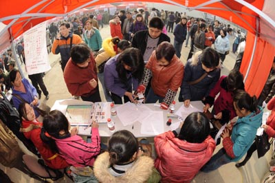12月16日,應(yīng)聘者在返鄉(xiāng)務(wù)工人員專場(chǎng)招聘會(huì)上求職。 當(dāng)日,在長(zhǎng)沙市天心區(qū)大托鎮(zhèn)湖南鋼材大市場(chǎng)舉辦“為長(zhǎng)沙返鄉(xiāng)農(nóng)民工找工作”的專場(chǎng)招聘會(huì)。據(jù)介紹,這次招聘會(huì)共有48家用人單位參加,提供2563個(gè)工作崗位。 |