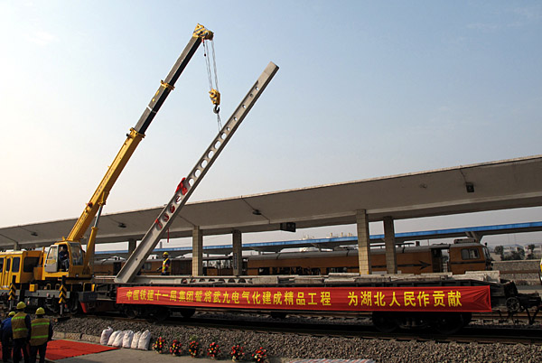 12月16日,在湖北省鄂州火車站,施工人員吊裝第一根電氣化線桿。當(dāng)日,武九鐵路(武漢-九江)電氣化改造工程在湖北鄂州動工。武九鐵路西起湖北武漢,途經(jīng)鄂州、黃石,東至江西九江,為國家一級干線鐵路。武九鐵路電氣化改造完成后,從南昌到武漢只需兩個半小時,比現(xiàn)在縮短1個多小時。