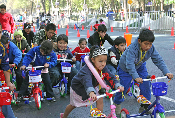 28日,在墨西哥首都墨西哥城的改革大道上,孩子們參加騎小三輪車比賽。組織者希望通過這次活動豐富孩子們節(jié)假日的生活。