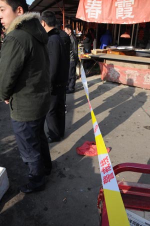 1月7日,河北三河市燕郊行宮活禽市場(chǎng)活禽交易區(qū)域已全部關(guān)閉,市場(chǎng)保安人員在現(xiàn)場(chǎng)警戒線前守護(hù)。 當(dāng)日,河北省三河市關(guān)閉燕郊地區(qū)所有活禽交易市場(chǎng),并對(duì)外部環(huán)境進(jìn)行采樣和徹底消毒。1月6日,北京市發(fā)生一例人感染高致病性禽流感死亡病例。據(jù)悉,死者生前曾接觸過(guò)從河北省三河市燕郊行宮市場(chǎng)購(gòu)買(mǎi)的活殺鴨肉。目前,三河市尚未發(fā)現(xiàn)禽流感疫情,疫情搜索和各項(xiàng)防控工作正在進(jìn)行中。