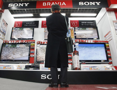 1月13日,一名男子在日本東京的索尼公司柜臺前駐足!度毡窘(jīng)濟新聞》網(wǎng)站當天援引索尼公司消息人士的話說,日本電子產(chǎn)業(yè)巨頭索尼公司2008財年(截至今年3月底)預(yù)計將出現(xiàn)1000億日元(約合70.65億人民幣)的運營虧損,這也將是索尼公司14年來的首次運營虧損。