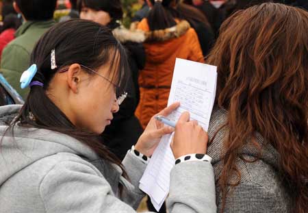 1月13日,一名畢業(yè)生在同學(xué)的背上填寫(xiě)求職申請(qǐng)表。 當(dāng)日,在位于昆明市的云南師范大學(xué)龍泉校區(qū),舉辦了一場(chǎng)主要面向師范類高校畢業(yè)生的大型就業(yè)洽談會(huì),共有200多家單位現(xiàn)場(chǎng)招賢,提供就業(yè)崗位數(shù)千個(gè),吸引昆明及其周邊眾多畢業(yè)生前來(lái)求職。2009年云南省的高校畢業(yè)生人數(shù)超過(guò)10萬(wàn)人,再創(chuàng)歷史新高。日前,云南省政府決定從2009年起每年安排1億元?jiǎng)?chuàng)業(yè)資金,用于支持大學(xué)畢業(yè)生和農(nóng)民工等自主創(chuàng)業(yè)。 |