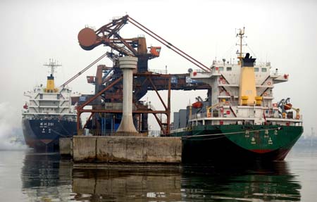 1月18日,輪船停泊在秦皇島港煤炭碼頭裝貨。記者從秦皇島港獲悉:該港2008年吞吐量再創(chuàng)歷史新高,達到2.49億噸,其中煤炭完成2.18億噸,同比增長1.8%;油品完成889萬噸,同比增長16.7%;集裝箱完成40.2萬標箱,同比增長34%。