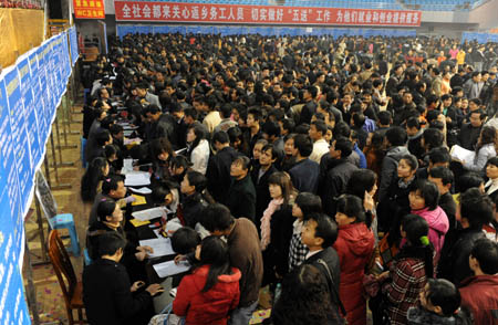 當(dāng)日,安徽省蚌埠市懷遠縣政府在縣勞動力市場舉辦2009年首場大型春季企業(yè)用工暨返鄉(xiāng)農(nóng)民工現(xiàn)場招聘會,該縣的120余家企業(yè)為返鄉(xiāng)農(nóng)民工提供就業(yè)崗位3000多個。新華社發(fā)(葉勝利攝)