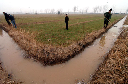 2月4日,陜西省蒲城縣洛惠渠陳莊管理站專業(yè)澆地隊員馬春成(右一)正在田間實施灌溉。 面對日趨嚴重的旱情,陜西渭南要求全市各灌區(qū)動用一切水利設(shè)施,挖掘水源潛力,擴大灌溉面積。渭南市是陜西小麥主產(chǎn)區(qū)之一,目前已經(jīng)形成百日連旱,全市各類農(nóng)作物受旱面積達到380萬畝,其中重旱災(zāi)20萬畝。