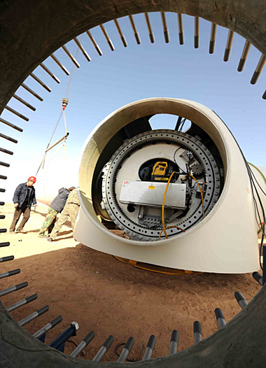 2月8日,施工人員正在內(nèi)蒙古巴彥淖爾市烏拉特后旗烏力吉風電場吊裝風機。擁有得天獨厚風能資源的內(nèi)蒙古自治區(qū)按照國家發(fā)展新型潔凈能源的產(chǎn)業(yè)政策,加快環(huán)京津大型風力發(fā)電基地建設(shè),200多家風電企業(yè)在內(nèi)蒙古追風逐電“搶灘登陸”。截至2009年初,全區(qū)風電裝機容量突破300萬千瓦。 | |