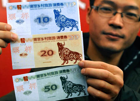 2月16日,工作人員在搖號儀式上展示3種“南京鄉(xiāng)村旅游消費券”。 當(dāng)日,南京市舉行“南京鄉(xiāng)村旅游消費券”發(fā)放搖號儀式,由12位市民代表搖號,從主城區(qū)89萬多戶居民家庭中隨機產(chǎn)生了20萬戶使用消費券的家庭,每戶將可獲得100元的旅游消費券。