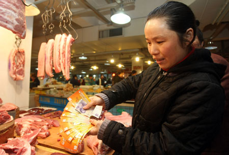 2月18日,在杭州市仙林苑農(nóng)貿(mào)市場,一位市民準(zhǔn)備用剛領(lǐng)到的農(nóng)貿(mào)市場消費券購買豬肉。當(dāng)日,杭州市下城區(qū)部分困難家庭領(lǐng)到了社區(qū)附近農(nóng)貿(mào)市場發(fā)放的專用消費券,持券家庭可在指定農(nóng)貿(mào)市場內(nèi)購買糧、油、菜等。1月底,杭州市部分農(nóng)貿(mào)市場率先發(fā)放農(nóng)貿(mào)市場專用消費券,惠及杭州市、區(qū)兩級低保、困難家庭。從2月18日開始的第二批消費券發(fā)放活動,參與這項活動的農(nóng)貿(mào)市場和受惠家庭范圍都有所擴(kuò)大。 |