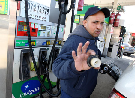 3月17日,在美國紐約的一個(gè)加油站,工人在為顧客加油。當(dāng)日,受到積極經(jīng)濟(jì)數(shù)據(jù)以及紐約股市強(qiáng)勁上漲的刺激,國際油價(jià)大幅上揚(yáng)近4%,收在每桶49美元之上,創(chuàng)下去年12月以來最高收盤價(jià)。