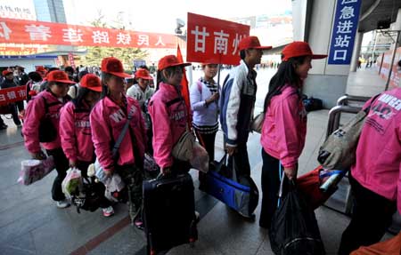 3月25日,“隴原妹”走進蘭州火車站。當(dāng)日,由甘肅省婦聯(lián)組織的甘肅省貧困地區(qū)“隴原妹”進京就業(yè)創(chuàng)業(yè)活動啟動,300多名來自貧困地區(qū)的婦女從蘭州火車站出發(fā)前往北京,她們將在北京進行培訓(xùn)后,在家政等服務(wù)行業(yè)就業(yè)。