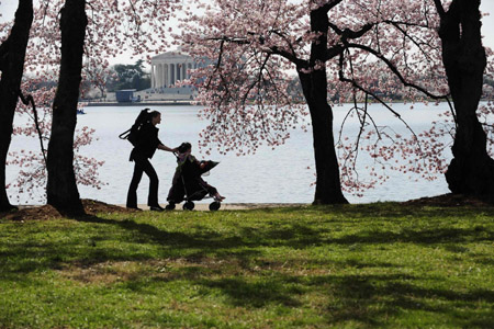 3月31日,游人在美國首都華盛頓蓄潮湖邊欣賞櫻花。今年的華盛頓櫻花節(jié)于3月28日至4月12日間舉行,預(yù)計將于4月1日至4日迎來櫻花盛開高峰。