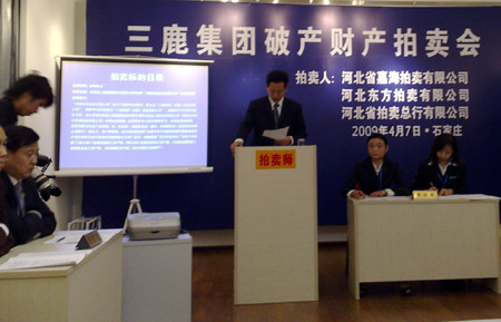 這是三鹿第二批破產(chǎn)財(cái)產(chǎn)拍賣會(huì)現(xiàn)場(chǎng)(4月7日攝)。當(dāng)日,石家莊三鹿集團(tuán)股份有限公司第二批破產(chǎn)財(cái)產(chǎn)在河北省嘉海拍賣有限公司進(jìn)行了拍賣,河北貝蘭德乳業(yè)有限公司和石家莊君樂(lè)寶乳業(yè)有限公司成功回購(gòu)了原屬三鹿的股權(quán)。