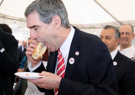 5月6日,在加拿大首都渥太華的國會山,加拿大最大反對黨自由黨領(lǐng)袖邁克爾·伊格納季耶夫大口享用加農(nóng)業(yè)和糧食部長格里·里茨派送的豬肉漢堡。里茨當天向加議員、政府工作人員派送豬肉漢堡,并強調(diào)加拿大的豬肉及豬肉制品是安全的,呼吁公眾增加豬肉消費,以幫助拯救陷入困境的加拿大養(yǎng)豬業(yè)。上周,加拿大西部一豬場的豬身上檢測出甲型H1N1流感病毒,一些國家隨即宣布禁止進口加拿大豬肉,加豬肉出口已下跌10%至15%。