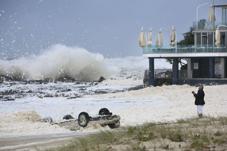 21日,在澳大利亞昆士蘭州的黃金海岸,一名當(dāng)?shù)厝擞孟鄼C(jī)拍攝被風(fēng)浪掀翻的汽車。據(jù)法新社報(bào)道,澳大利亞東北部沿海地區(qū)當(dāng)日遭暴風(fēng)雨襲擊,導(dǎo)致數(shù)萬(wàn)家庭停電,數(shù)百所學(xué)校被迫關(guān)閉。