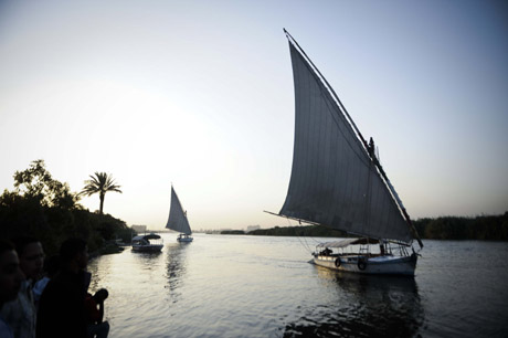 22日,游客乘帆船在埃及首都開羅尼羅河上漂游。近日,埃及旅游部長賈拉納宣布,由于遭遇全球經(jīng)濟危機,2009年前4個月埃及旅游收入下滑到36億美元,同比減少13.2%。