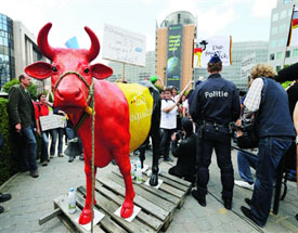 6月18日,在比利時首都布魯塞爾,奶農(nóng)在歐盟總部外示威。當(dāng)日,近千名來自德國、比利時等歐盟國家的奶農(nóng)聚集在歐盟總部外舉行示威游行,要求維護奶農(nóng)的利益,阻止牛奶收購價格的進一步下跌。
