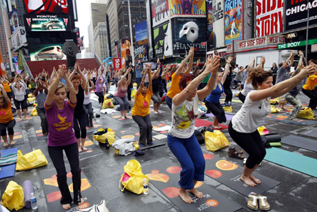 21日,上千名瑜伽愛好者聚集在紐約時(shí)報(bào)廣場(chǎng),用集體瑜伽的方式迎接夏至的到來(lái)。