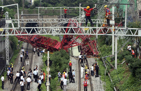6日,在韓國首爾,工人修復(fù)鐵路設(shè)施,搬移倒塌的塔吊。當(dāng)日,首爾一處位于鐵路旁的高50米的工地塔吊倒塌,造成一名塔吊操作員死亡,鐵路運(yùn)輸中斷數(shù)小時(shí)。
