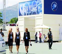 7月7日,在意大利中部拉奎拉,媒體工作人員經(jīng)過臨時搭建的八國首腦會議媒體村。八國集團(tuán)首腦會議及其相關(guān)會議將于7月8日至10日在意大利拉奎拉舉行。會議新聞中心于7月7日開始對媒體開放。