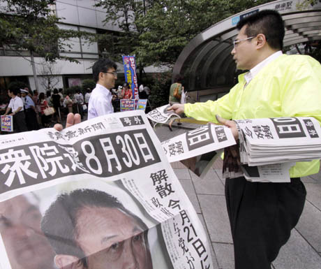 13日,一名日本男子在東京分發(fā)刊登舉行眾議院大選消息的報紙?zhí)乜。?jù)日本媒體報道,日本首相麻生已同意下周解散眾議院,并在8月30日舉行大選。
