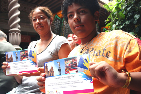28日,在墨西哥首都墨西哥城,游客展示醫(yī)療便利卡。當日,墨西哥城市政府向第一批10名游客發(fā)放醫(yī)療便利卡,旨在吸引更多國內外游客。持此卡的游客可以享受流感的預防和治療,突發(fā)事故緊急救援,急診及送藥服務等,游客只需支付少量費用。 新華社發(fā)