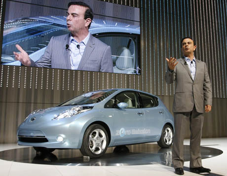 8月2日,日本日產(chǎn)自動車公司首席執(zhí)行官卡洛斯·戈恩在位于橫濱的新總部大樓的揭幕儀式上介紹其首款純電動汽車“葉子”。日產(chǎn)表示,“葉子”將于2010年底投放市場,先期在日本、美國和歐洲市場銷售。