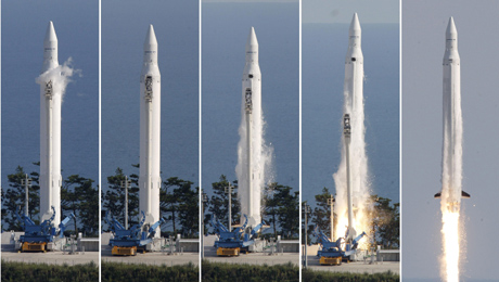 8月25日,在韓國南部的羅老宇航中心,韓國首枚運(yùn)載火箭“羅老”號發(fā)射升空(拼版照片)。韓國羅老宇航中心當(dāng)日宣布,“羅老”號運(yùn)載火箭應(yīng)于306公里高度進(jìn)行分離,但實際分離高度為342公里,二級火箭未進(jìn)入預(yù)定軌道,“屬于部分發(fā)射失敗”。