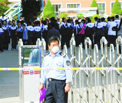 圖為:8月31日,衛(wèi)生部門一名工作人員在發(fā)生甲型H1N1流感暴發(fā)疫情的蘭州某中學大門外值班。據(jù)甘肅省衛(wèi)生廳通報,截至8月30日15時已確診26例,首例病例8月28日確診。 |