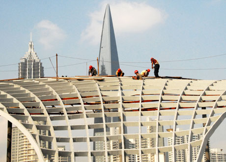 9月7日,工人在上海新十六鋪碼頭的“浦江之云”玻璃天棚上施工。 近日,上海城市景觀新地標(biāo)———新十六鋪碼頭的主體工程完成,玻璃天棚、親水平臺和駁船碼頭等主體建筑現(xiàn)出雛形,工程進(jìn)入機(jī)電安裝和裝飾施工階段。上海的新十六鋪碼頭計(jì)劃于2010年世博會前正式投入使用,屆時將成為上海世博會的“水上門戶”。