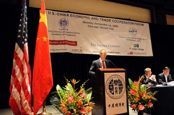 14日,美國(guó)商務(wù)部副部長(zhǎng)助理蔡瑞德在會(huì)上發(fā)表講話。當(dāng)日,美中經(jīng)貿(mào)投資合作論壇在美國(guó)芝加哥舉行,中國(guó)貿(mào)促會(huì)副會(huì)長(zhǎng)于平率領(lǐng)由167名企業(yè)家組成的中國(guó)企業(yè)家代表團(tuán)參加了本次論壇。與會(huì)人士一致呼吁在尚未完全克服經(jīng)濟(jì)危機(jī)的形勢(shì)下,中美兩國(guó)需進(jìn)一步加強(qiáng)經(jīng)貿(mào)合作,為世界經(jīng)濟(jì)的復(fù)蘇做貢獻(xiàn)。新華社記者胡光耀攝 |
