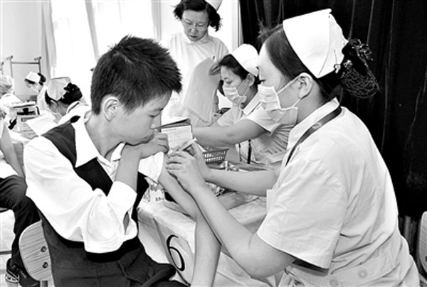 9月21日,京源學校的學生在接種甲型H1N1流感疫苗。 從當日起,北京市在全國率先啟動甲型H1N1流感疫苗接種工作,按照不同人群疫苗接種的優(yōu)先次序,北京市目前優(yōu)先對參與國慶慶典活動的學生開展接種。新華社發(fā)