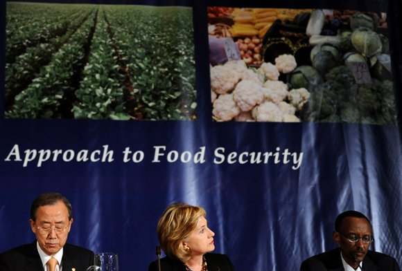 9月26日,聯(lián)合國秘書長潘基文(左)、美國國務(wù)卿希拉里(中)和盧旺達(dá)總統(tǒng)卡加梅出席在美國紐約聯(lián)合國總部舉行的糧食安全會議。當(dāng)日,來自100多個國家的代表在聯(lián)合國總部召開會議,討論如何加強(qiáng)世界糧食安全問題。