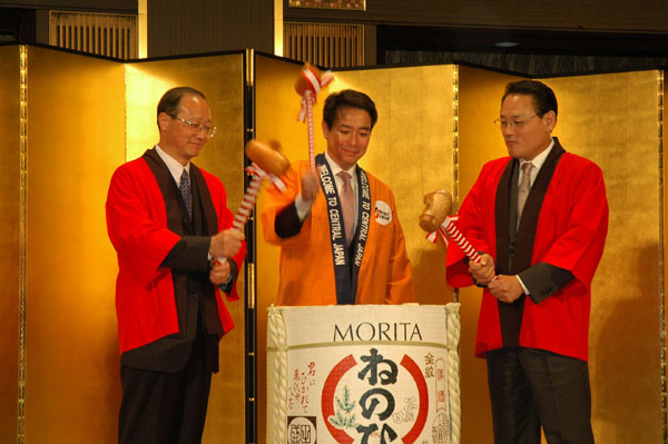 17日,在日本名古屋,中國國家旅游局局長邵琪偉(左)、日本國土交通大臣前原誠司(中)和韓國文化體育觀光部長官柳仁村(右)以敲開酒桶的方式啟動(dòng)第四屆中日韓旅游部長會(huì)議。第四屆中國、日本、韓國旅游部長會(huì)議17日晚在日本名古屋開幕。中日韓三國旅游部門領(lǐng)導(dǎo)人表示,將進(jìn)一步加強(qiáng)三國旅游合作,攜手共進(jìn),應(yīng)對危機(jī)。