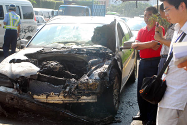 10月30日,一輛寶馬汽車在?诮诸^正常行駛時(shí),突然自燃起火,消防等部門趕到將火撲滅時(shí),車頭已燒毀,直到交警部門將車拖走,受阻近2個(gè)小時(shí)的交通才得以順暢。據(jù)車主稱,寶馬車未購(gòu)買自燃保險(xiǎn),自燃事故中無(wú)人員傷亡。新華社發(fā)