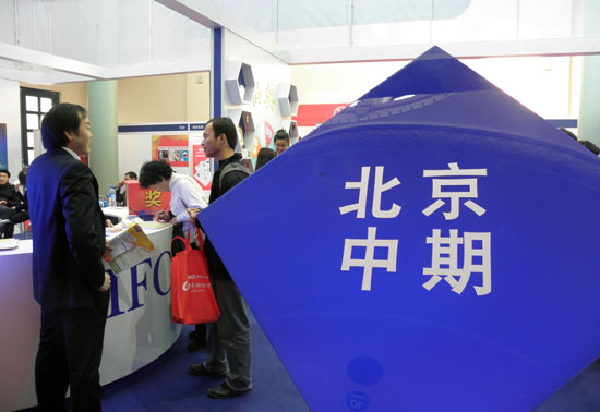 11月5日拍攝的第五屆北京國際金融博覽會(huì)北京中期期貨公司展臺(tái)。當(dāng)日,為期4天的第五屆北京國際金融博覽會(huì)在北京展覽館開幕。本屆金博會(huì)吸引了銀行、證券和基金公司、保險(xiǎn)公司等百余家機(jī)構(gòu)參展。新華社發(fā)