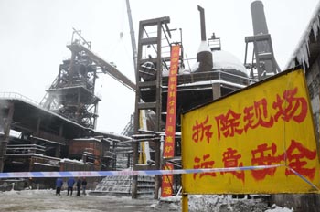 河北淘汰落后鋼鐵產(chǎn)能,邢臺(tái)德龍鋼鐵實(shí)業(yè)有限公司205立方米高爐拆除現(xiàn)場(11月12日拍攝