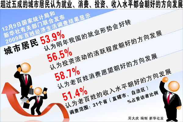 國(guó)家統(tǒng)計(jì)局社情民意調(diào)查中心與新華通訊社所屬經(jīng)濟(jì)參考報(bào)、新華網(wǎng)、新聞研究所等單位今年11月聯(lián)合啟動(dòng)“2009年百姓經(jīng)濟(jì)生活調(diào)查”,12月9日正式發(fā)布調(diào)查結(jié)果。 此次調(diào)查由三部分組成,分別是國(guó)家統(tǒng)計(jì)局社情民意調(diào)查中心受新華社委托進(jìn)行的電話調(diào)查,新華社31個(gè)分社在所在省區(qū)市圍繞城鄉(xiāng)百姓經(jīng)濟(jì)生活熱點(diǎn)進(jìn)行的入戶訪問(wèn),以及在新華網(wǎng)上開展的網(wǎng)民調(diào)查。內(nèi)容涉及對(duì)金融危機(jī)的知曉度、對(duì)金融危機(jī)影響的感受、對(duì)金融危機(jī)應(yīng)對(duì)措施的認(rèn)知和對(duì)未來(lái)經(jīng)濟(jì)走勢(shì)的判斷等。(詳見今日二、六、七版) |
