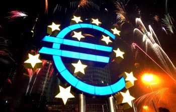 圖為懸掛在歐洲中央銀行總部前被霓虹燈和焰火映襯的歐元標(biāo)志。新華社發(fā) |