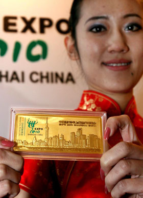 1月19日,模特在展示上海世博會(huì)彩色紀(jì)念金條。 當(dāng)日,經(jīng)上海世博會(huì)事務(wù)協(xié)調(diào)局授權(quán),由中國金幣總公司發(fā)行、上海金幣投資有限公司總經(jīng)銷的中國2010年上海世博會(huì)彩色紀(jì)念金條(第2組)及彩色紀(jì)念銀條系列產(chǎn)品在上海正式發(fā)布。