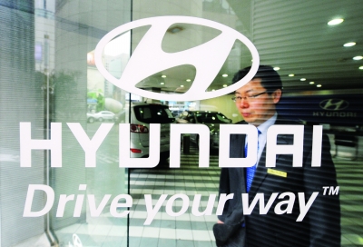 2月24日,在韓國(guó)首都首爾,韓國(guó)現(xiàn)代汽車(chē)公司員工從印有公司標(biāo)志的玻璃門(mén)前走過(guò)。 韓國(guó)現(xiàn)代汽車(chē)公司當(dāng)日宣布,由于車(chē)門(mén)鎖的問(wèn)題,將于近期在美國(guó)及韓國(guó)本土召回該公司生產(chǎn)的新款索納塔轎車(chē)。