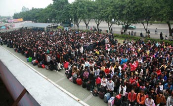 2月22日,大量應(yīng)聘者等候在富士康深圳龍華招募點(diǎn)。面對節(jié)后珠三角“用工荒”,一些用工大戶紛紛出招應(yīng)對。代工企業(yè)富士康用工缺口大約5萬人,該公司采取內(nèi)部員工推薦獎勵制度,即員工推薦老鄉(xiāng)有獎勵,包括報(bào)銷到深圳的路費(fèi)及獎金200元。新華社記者