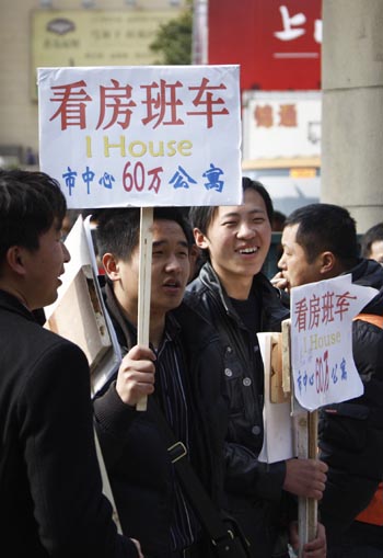 3月18日,參展房地產(chǎn)企業(yè)的工作人員在廣場(chǎng)上招攬看房者。 當(dāng)日,有“上海樓市風(fēng)向標(biāo)”之稱的“2010上海之春房產(chǎn)展示交易會(huì)”在上海展覽中心開幕。此次參展的國內(nèi)開發(fā)商約200家,展覽面積達(dá)2萬平方米。在2009年底以來推出的密集調(diào)控政策影響下,本屆展會(huì)首日盡管人氣不減,但市場(chǎng)的觀望氣氛也悄然升溫。