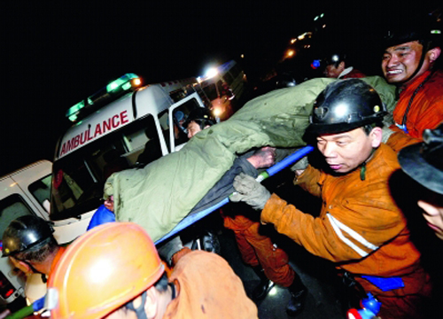 圖為4月5日,華晉焦煤王家?guī)X礦“3·28”透水事故首批獲救礦工被救援人員抬出井口。