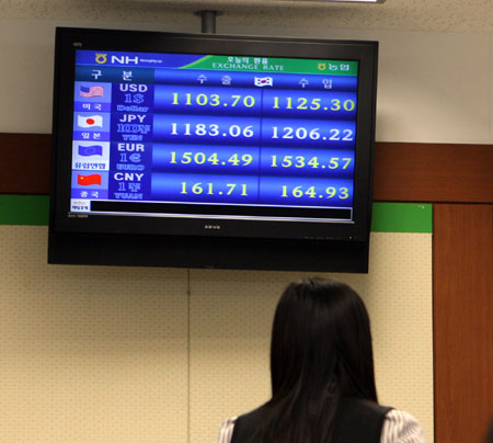 12日,韓國首爾一家銀行的工作人員查看匯率牌價。 截至當(dāng)日上午9時19分,首爾外匯市場韓元匯率為1美元兌換1111.80韓元,較前一個交易日上漲6.4韓元。這是自2008年9月12日以來,韓元兌美元匯率的最高值。