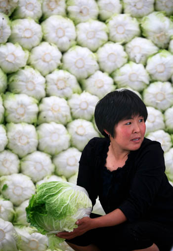 6月3日,在濟(jì)南市匡山農(nóng)產(chǎn)品綜合交易市場(chǎng),一位商販在挑選白菜。
