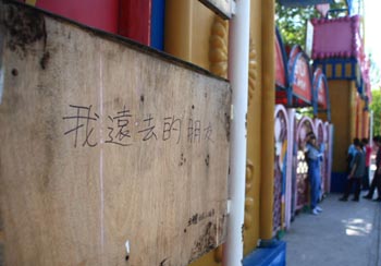 游樂場(chǎng)的大門墻壁、水泥柱子上,有密密麻麻的數(shù)千條留言,6月15日留名為“陽(yáng)”的人留言“我想再上一次摩天輪,再玩一次激流勇進(jìn),再坐一次海盜船!”“最美麗的回憶從這里開始,也從這里結(jié)束!痹诖肆粝旅篮糜洃浀娜藖硭屠吓笥炎詈笠怀,然而,如今“歡樂不再,往事何存?……”